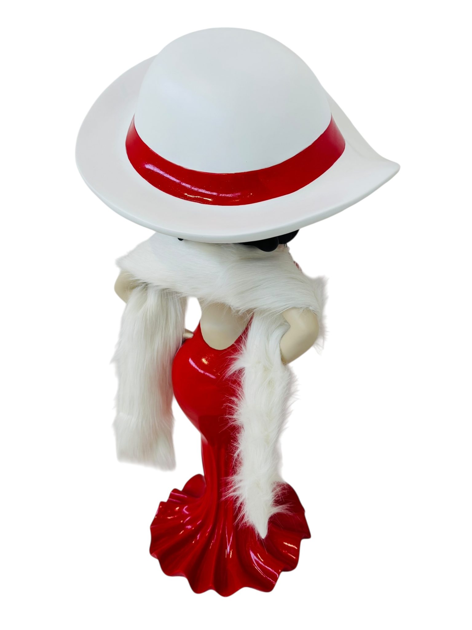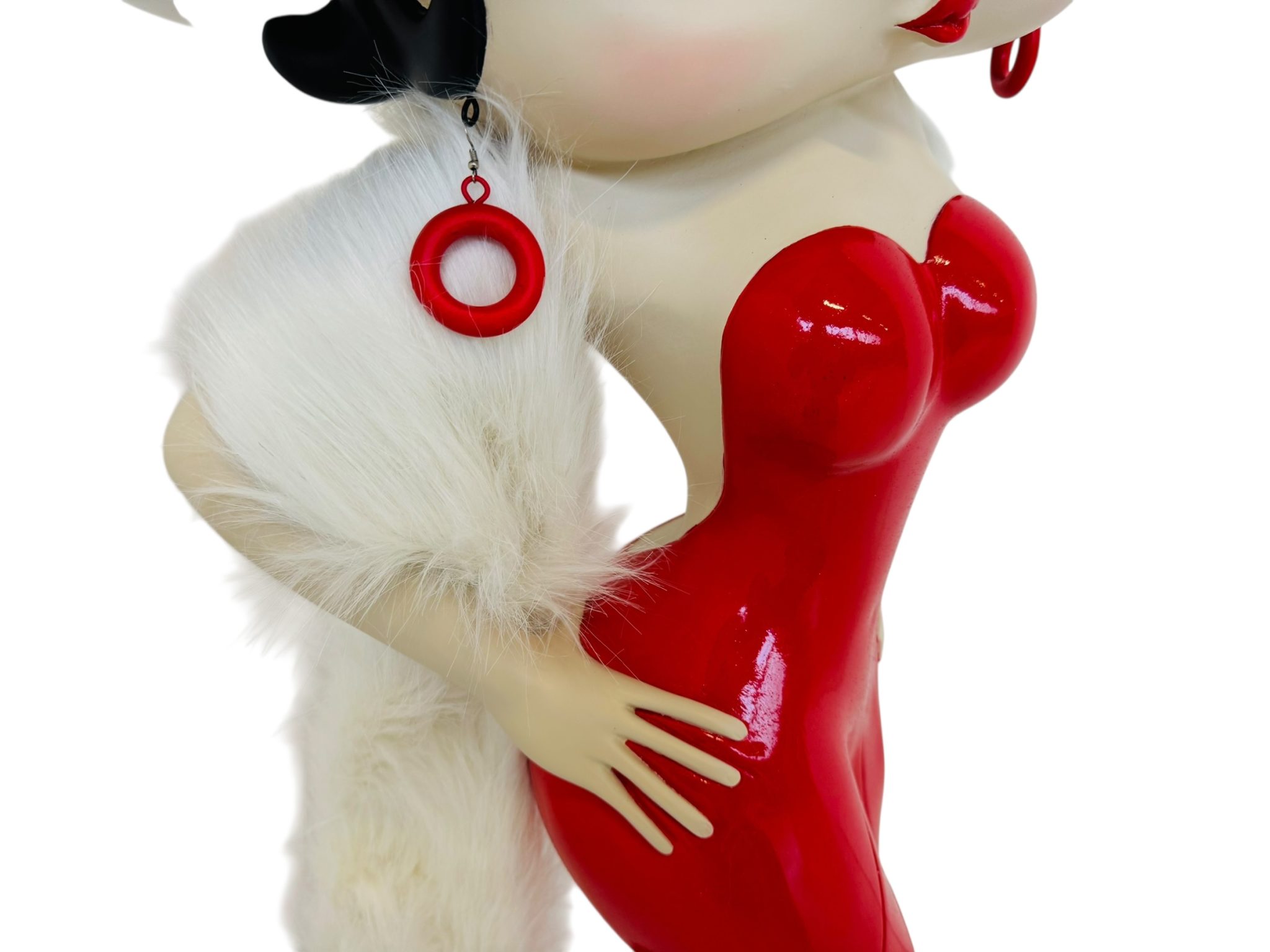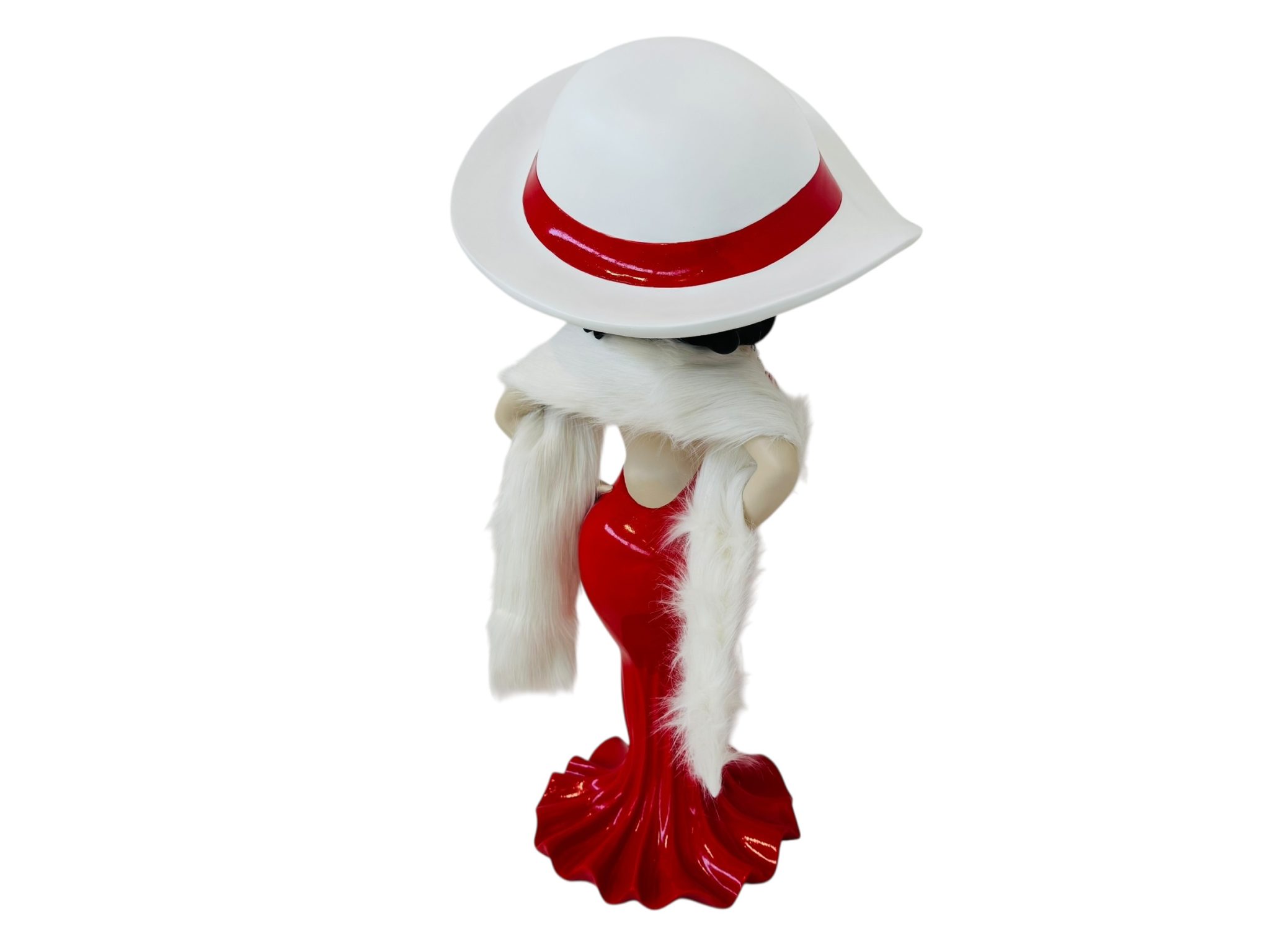 A completare il look, una sciarpa vera in filamenti bianchi effetto pelliccia, morbida e raffinata, fornita in dotazione: un dettaglio che rende la figura ancora più glamour e tridimensionale.
