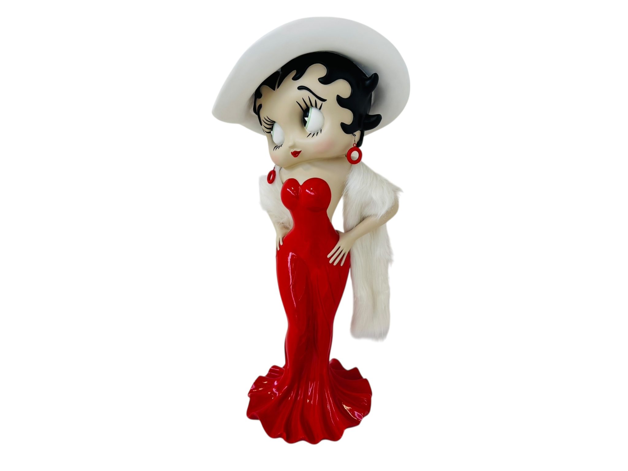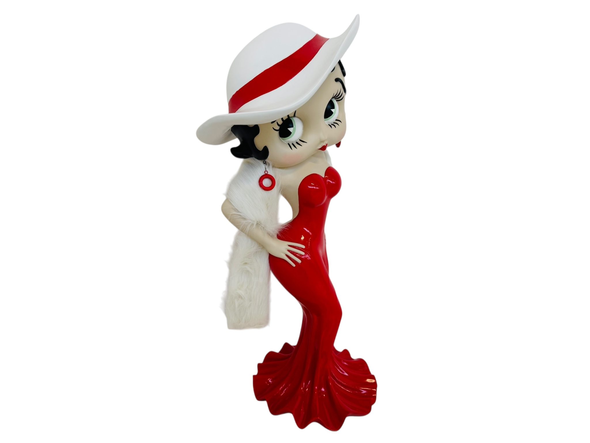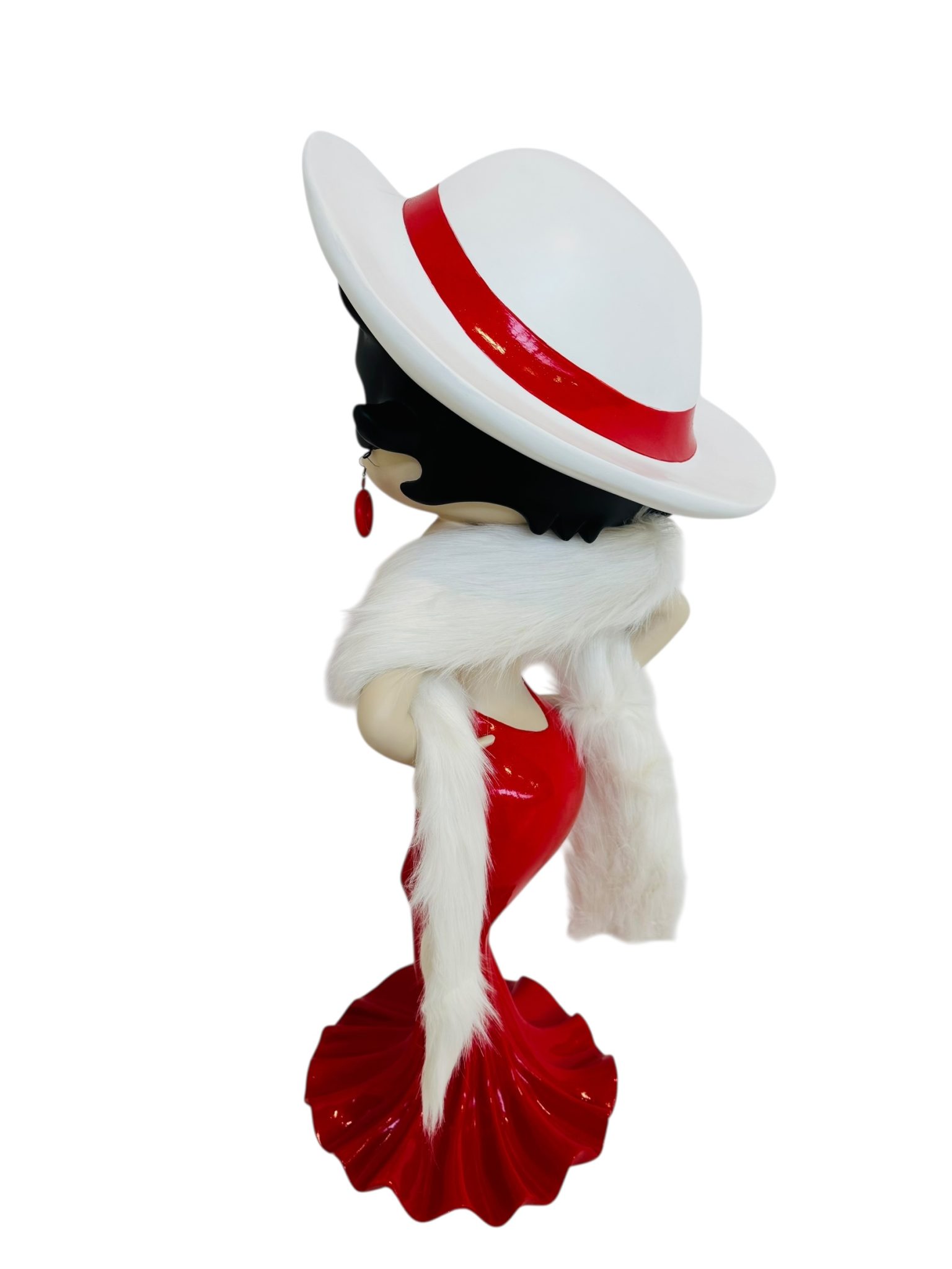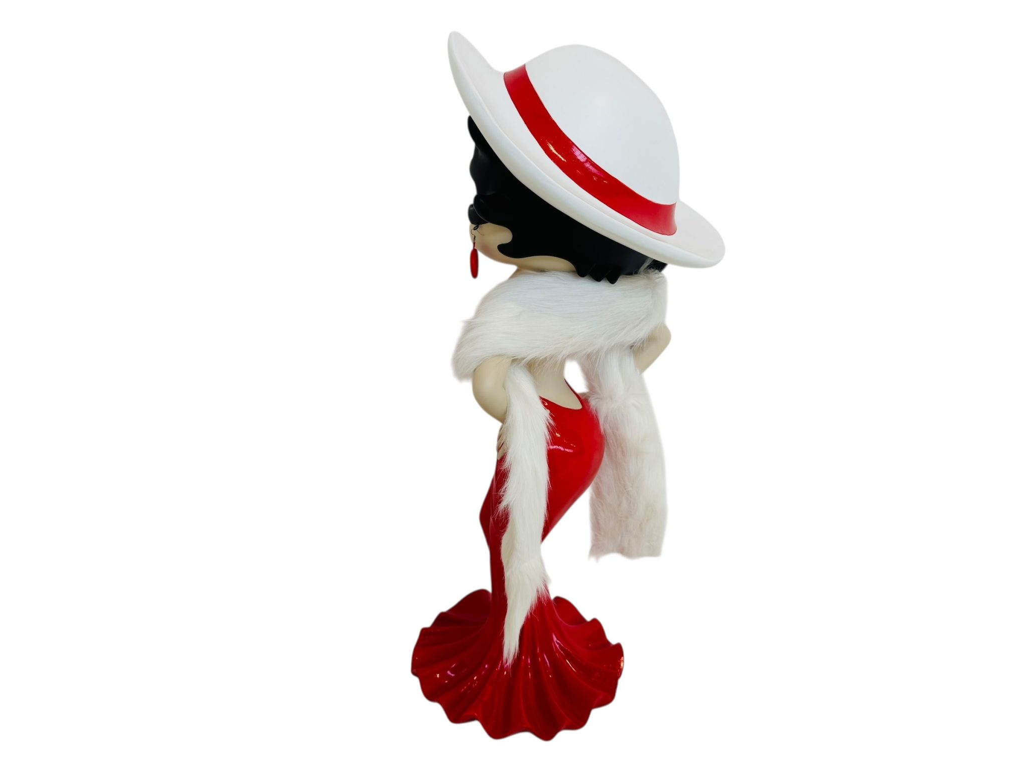 A completare il look, una sciarpa vera in filamenti bianchi effetto pelliccia, morbida e raffinata, fornita in dotazione: un dettaglio che rende la figura ancora più glamour e tridimensionale.