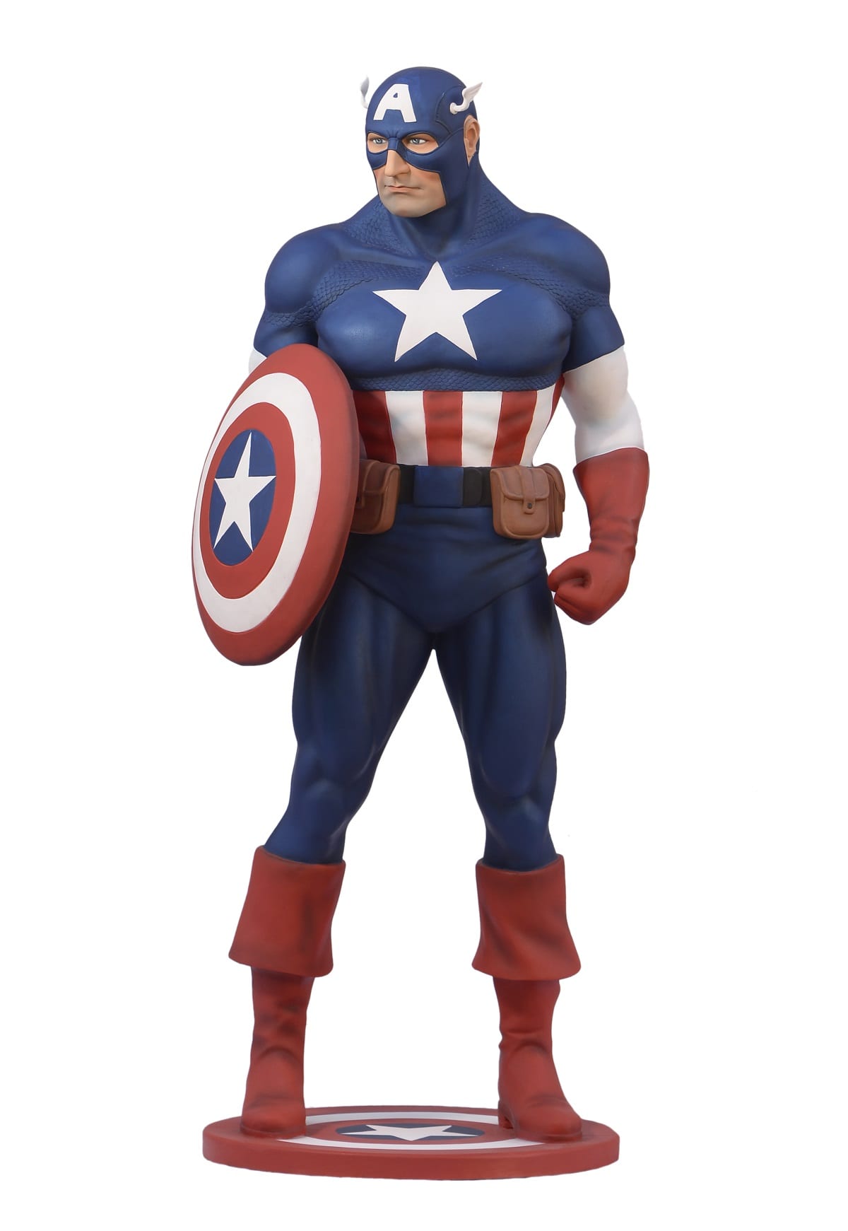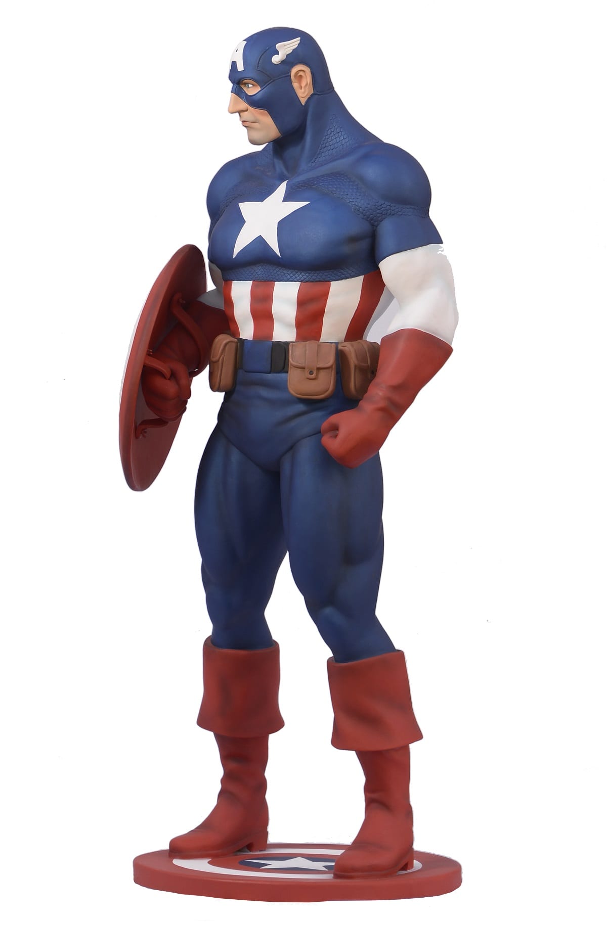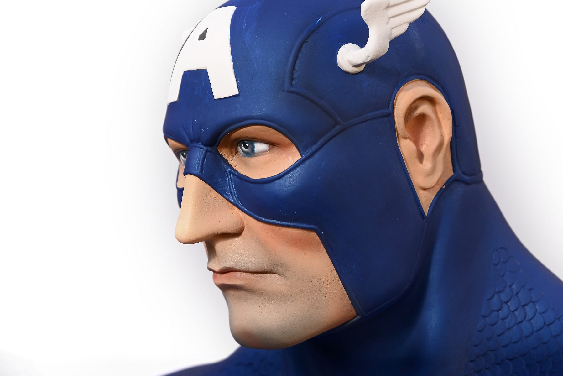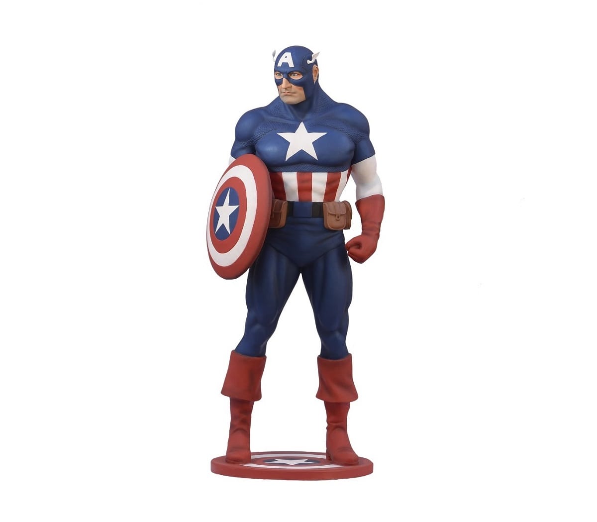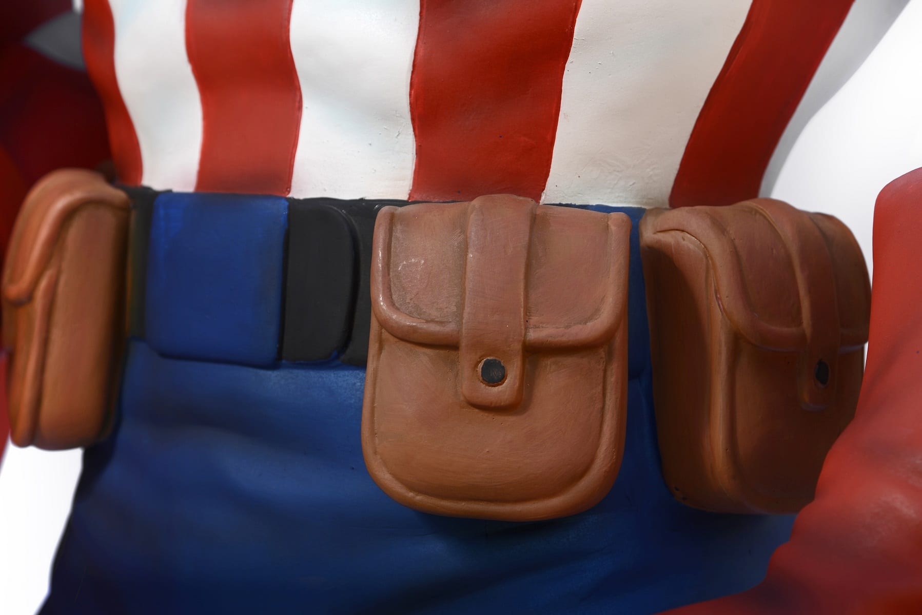 Riproduzione in fibra di vetro del personaggio simbolo della saga della Marvel “Capitan America”, completo di scudo.