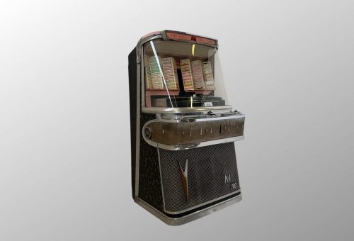 Questa versione italiana dell’AMI Continental conserva tutto l’impatto scenografico del design originale, affiancandolo a una selezione a ruota tipica del mercato europeo. Il risultato è un jukebox che unisce estetica americana e soluzioni meccaniche adattate al gusto e all’utilizzo italiano degli anni ’60.