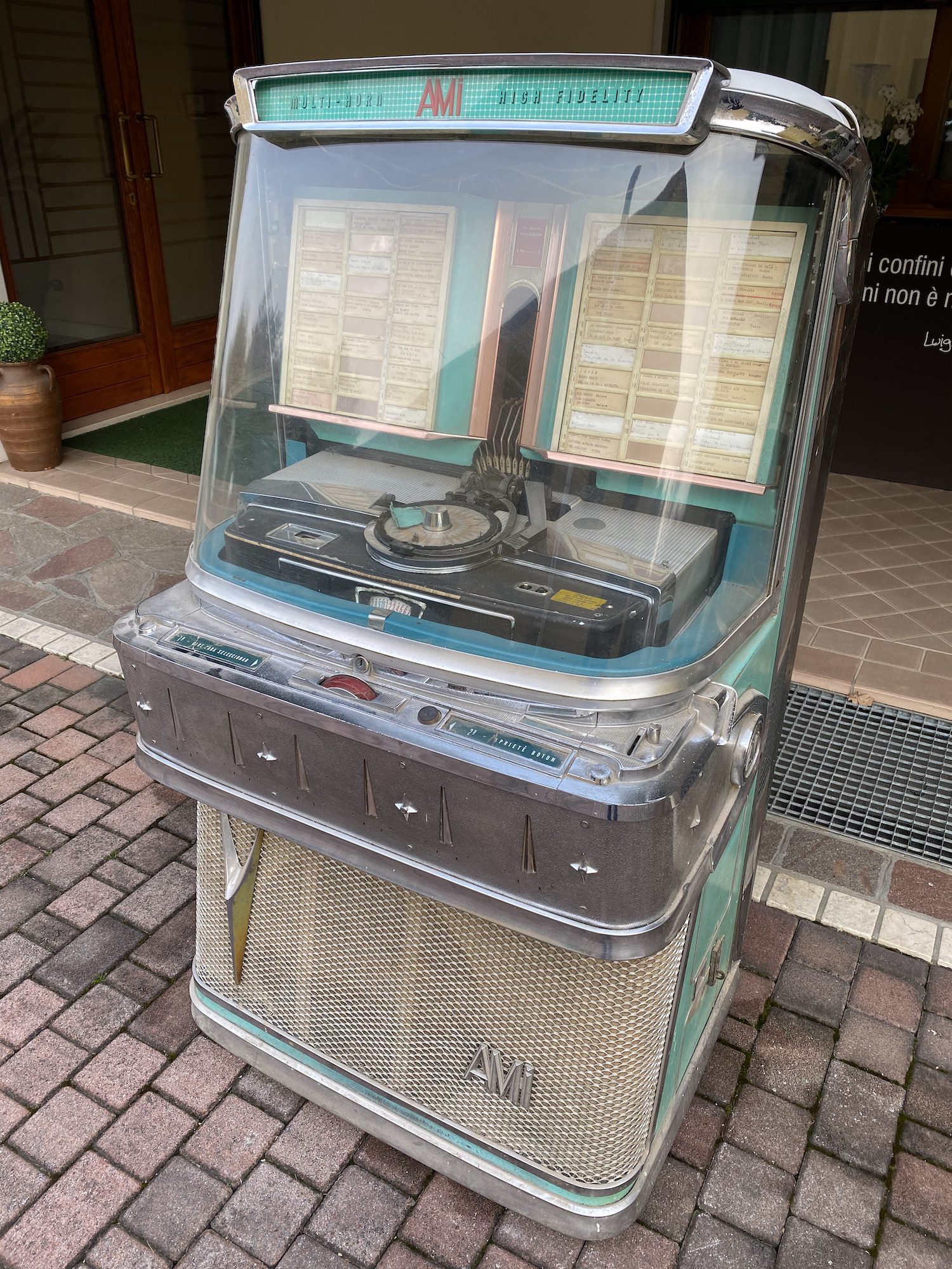 Il Juke box Ami I Fascione del 1958 veniva prodotto in vari modelli, 100 0 200 selezioni a ruota, o a tasti ( il modello americano ). Restyling del modello H prodotto l’anno prima, si presenta molto più slanciato, con gli spigoli arrotondati, una illuminazione più sobria e in due versioni di colore: nero-rosa o turchese. Si diffuse e si fece apprezzare sopratutto in Europa e in Italia per la concorrenzionalitò del prezzo d’acquisto e per la robustezza dell’ormai consolidato meccanismo X Record Changer.