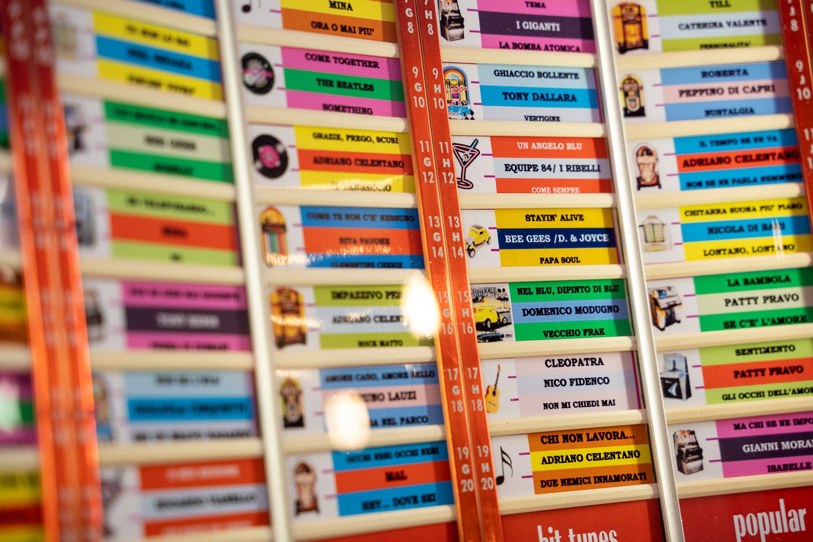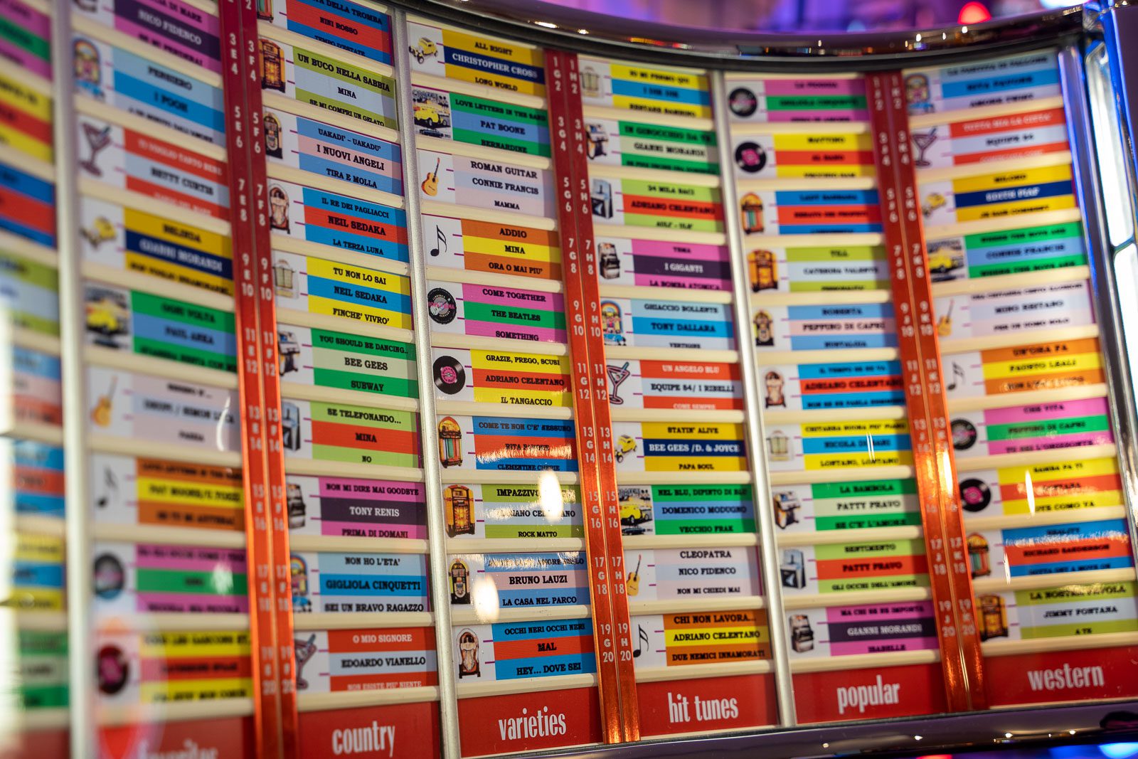 Il jukebox verrà consegnato corredato di 100 dischi 45 giri con titoli di un certo rilievo storico e completo di etichette da noi stampate.