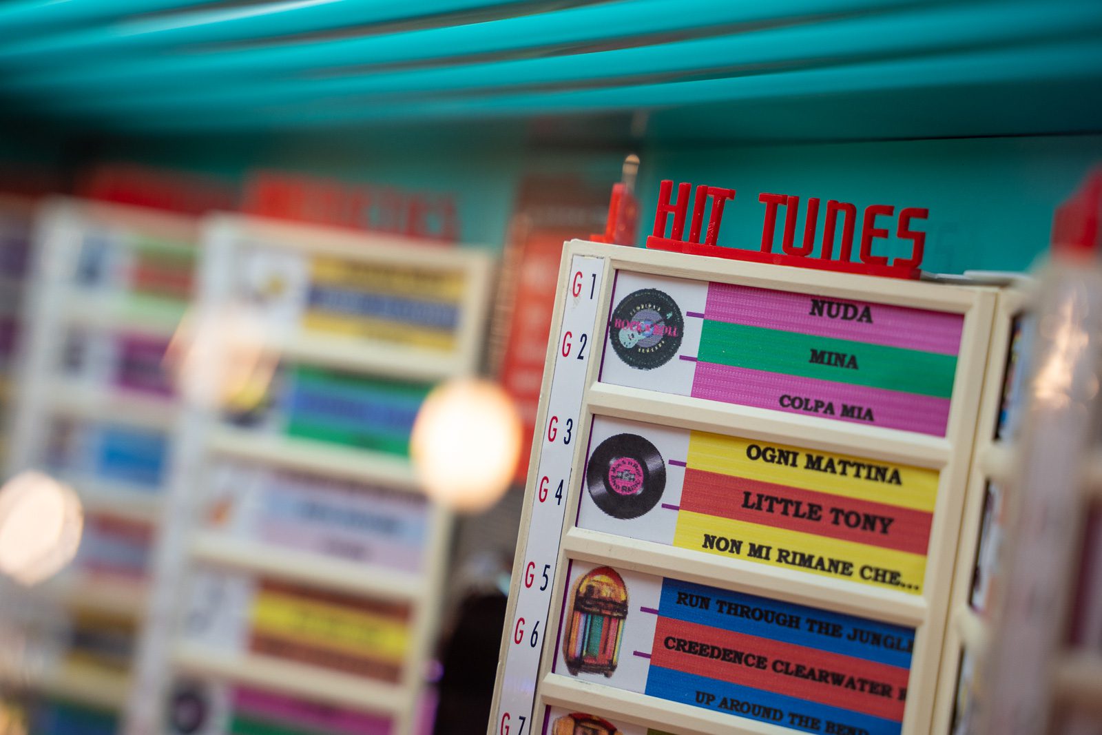 Il jukebox verrà consegnato corredato di 100 dischi 45 giri con titoli di un certo rilievo storico e completo di etichette da noi stampate.