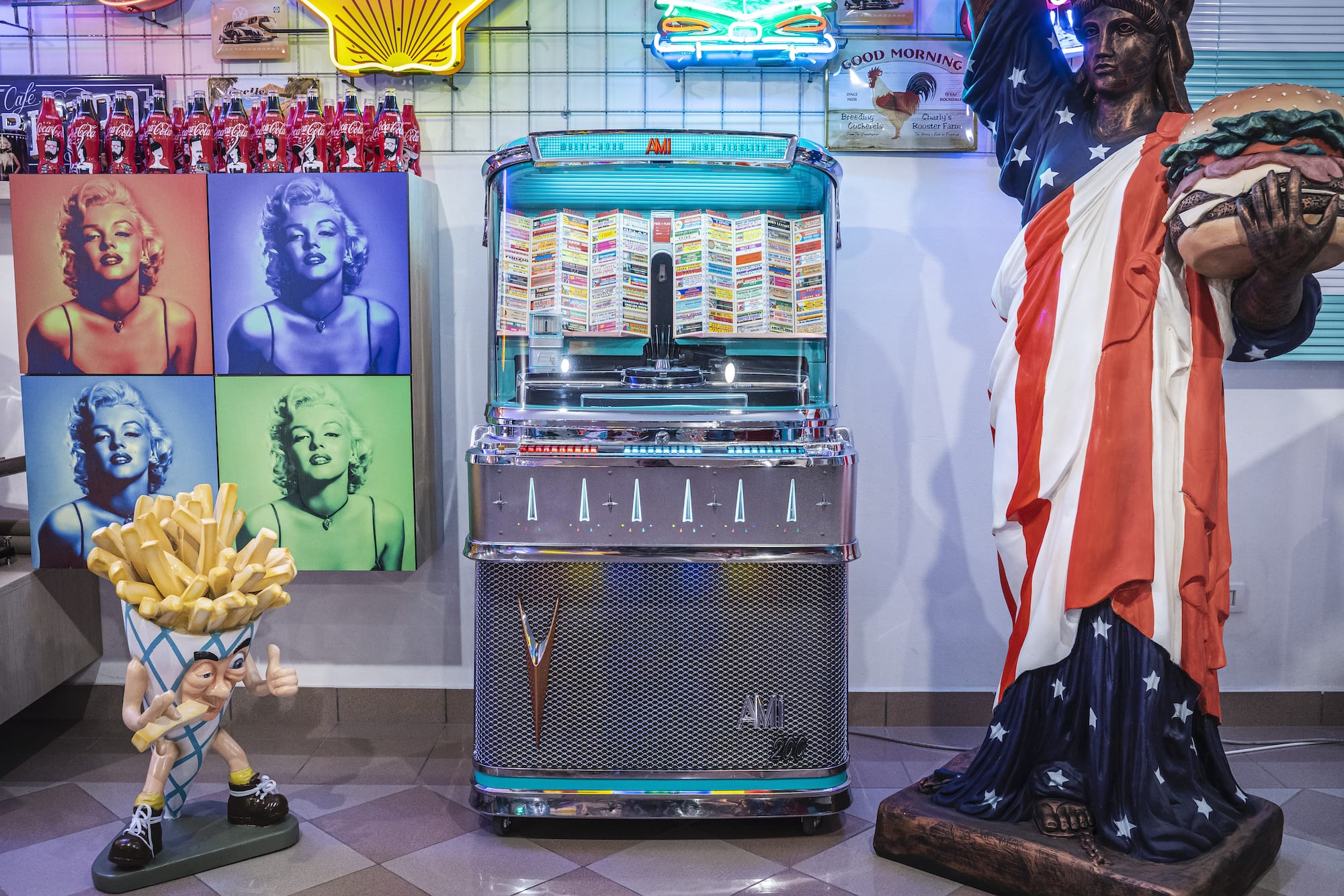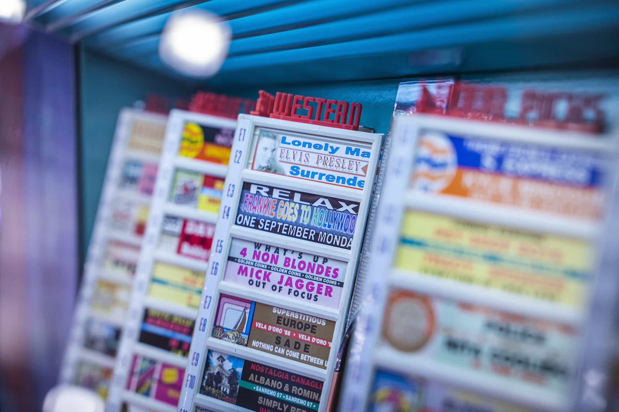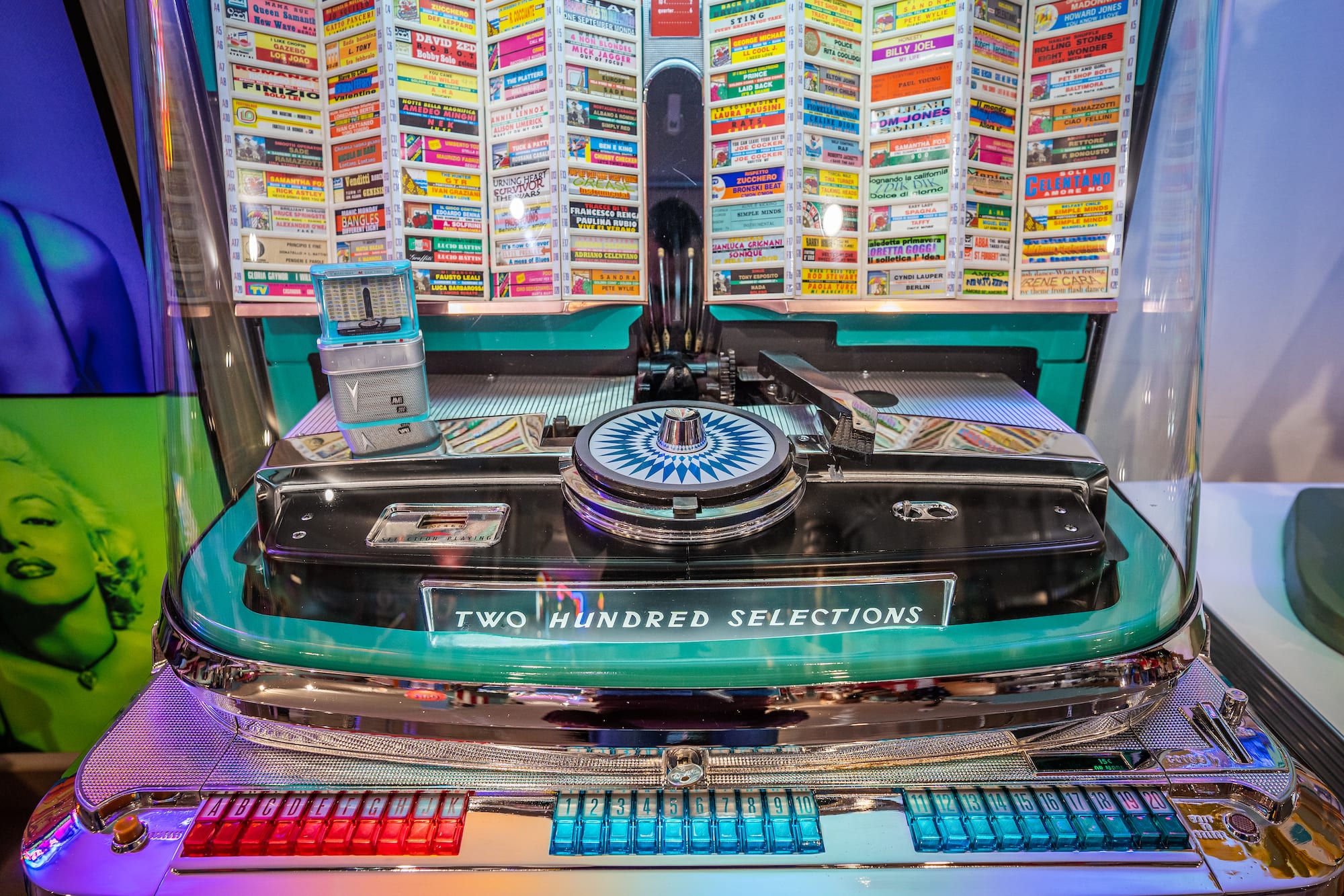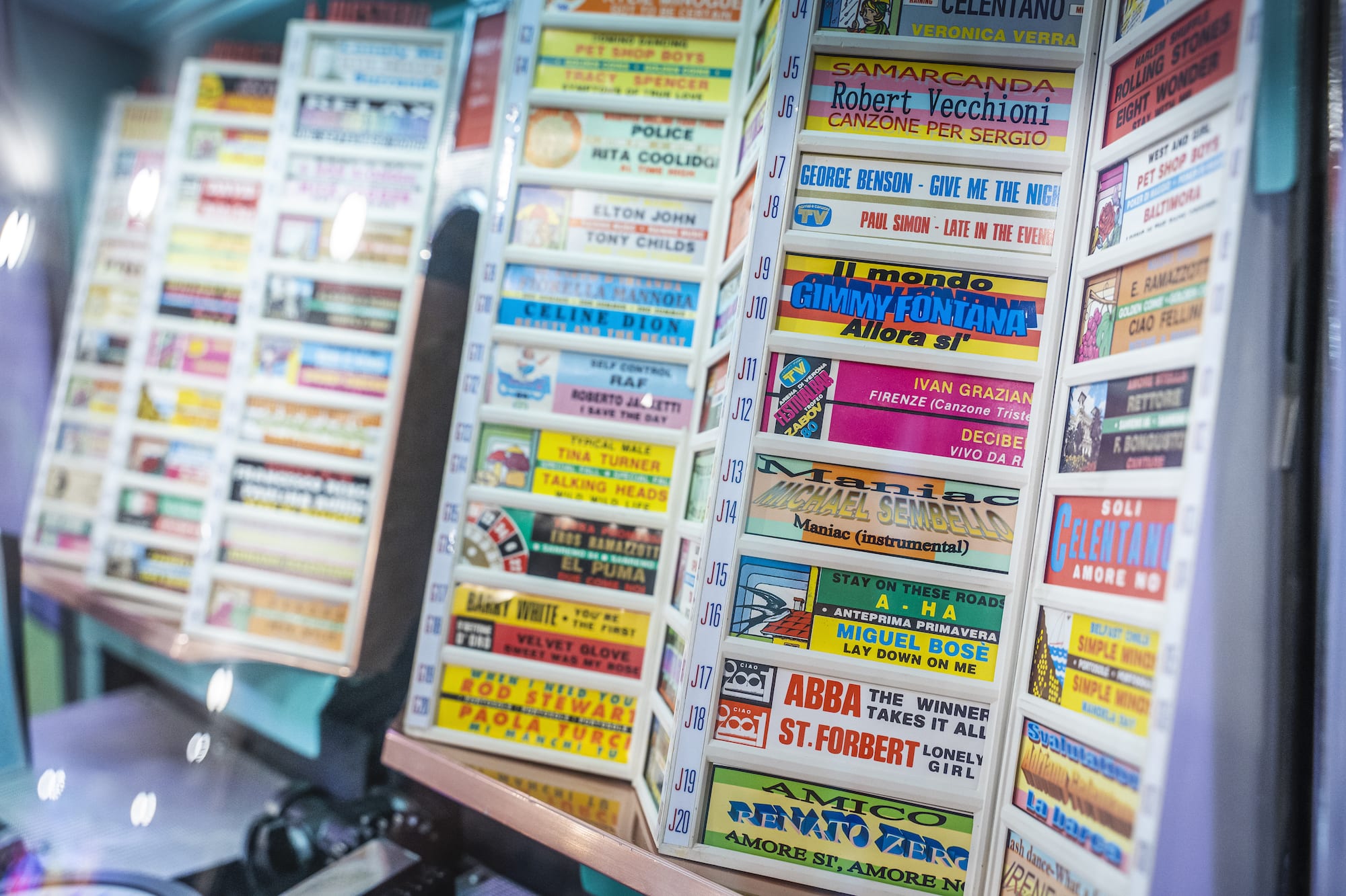Il jukebox verrà consegnato corredato di 100 dischi 45 giri con titoli di un certo rilievo storico e completo di etichette da noi stampate.