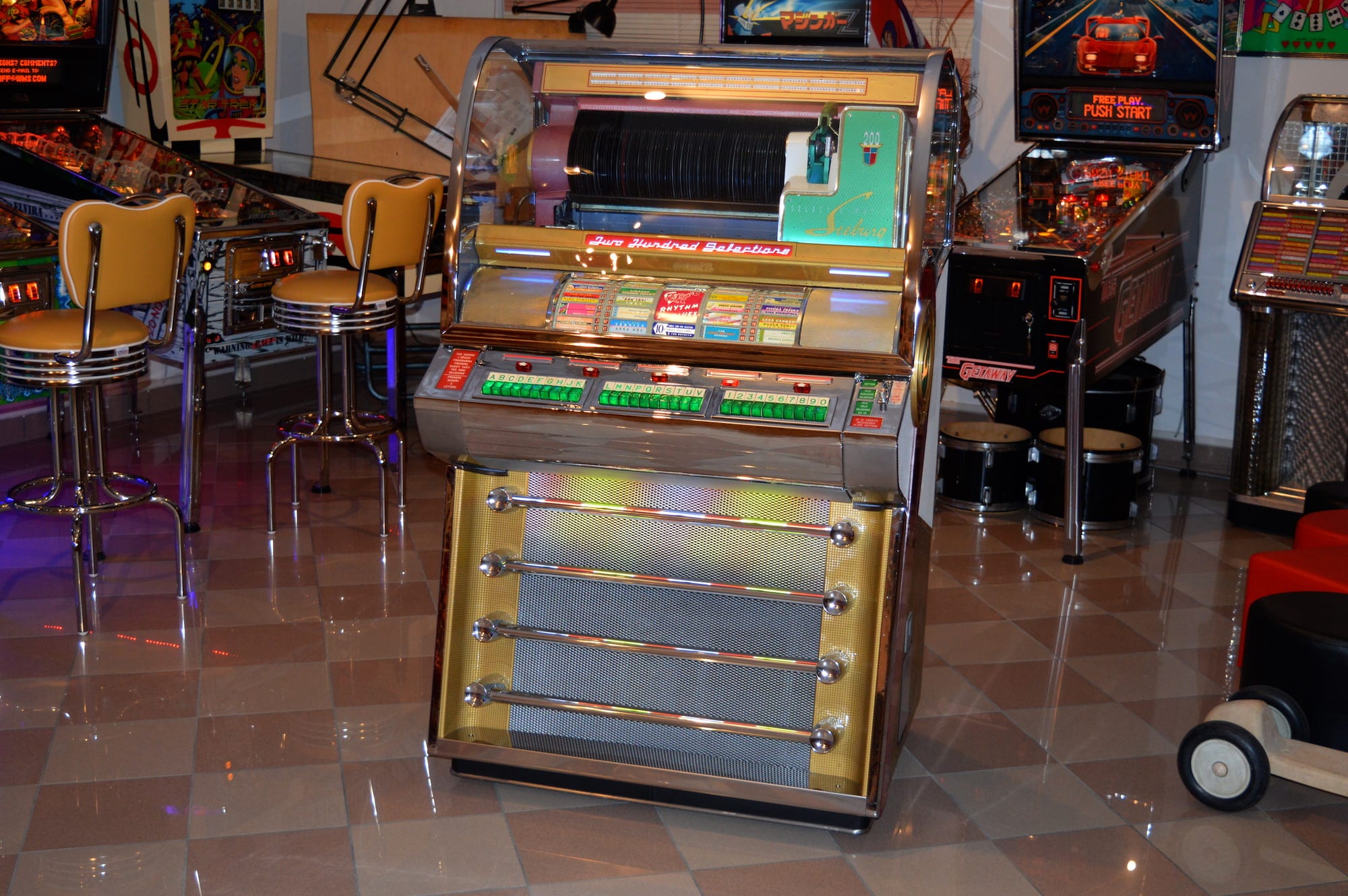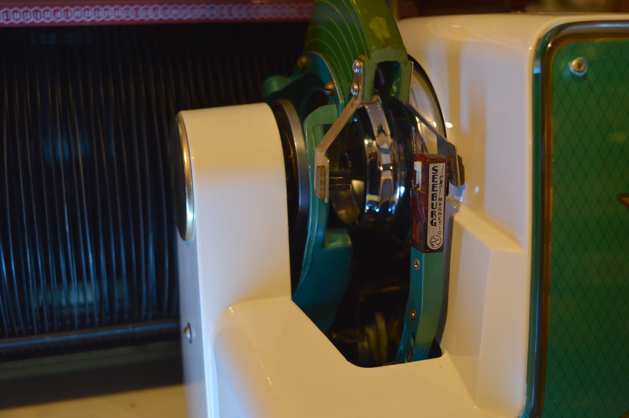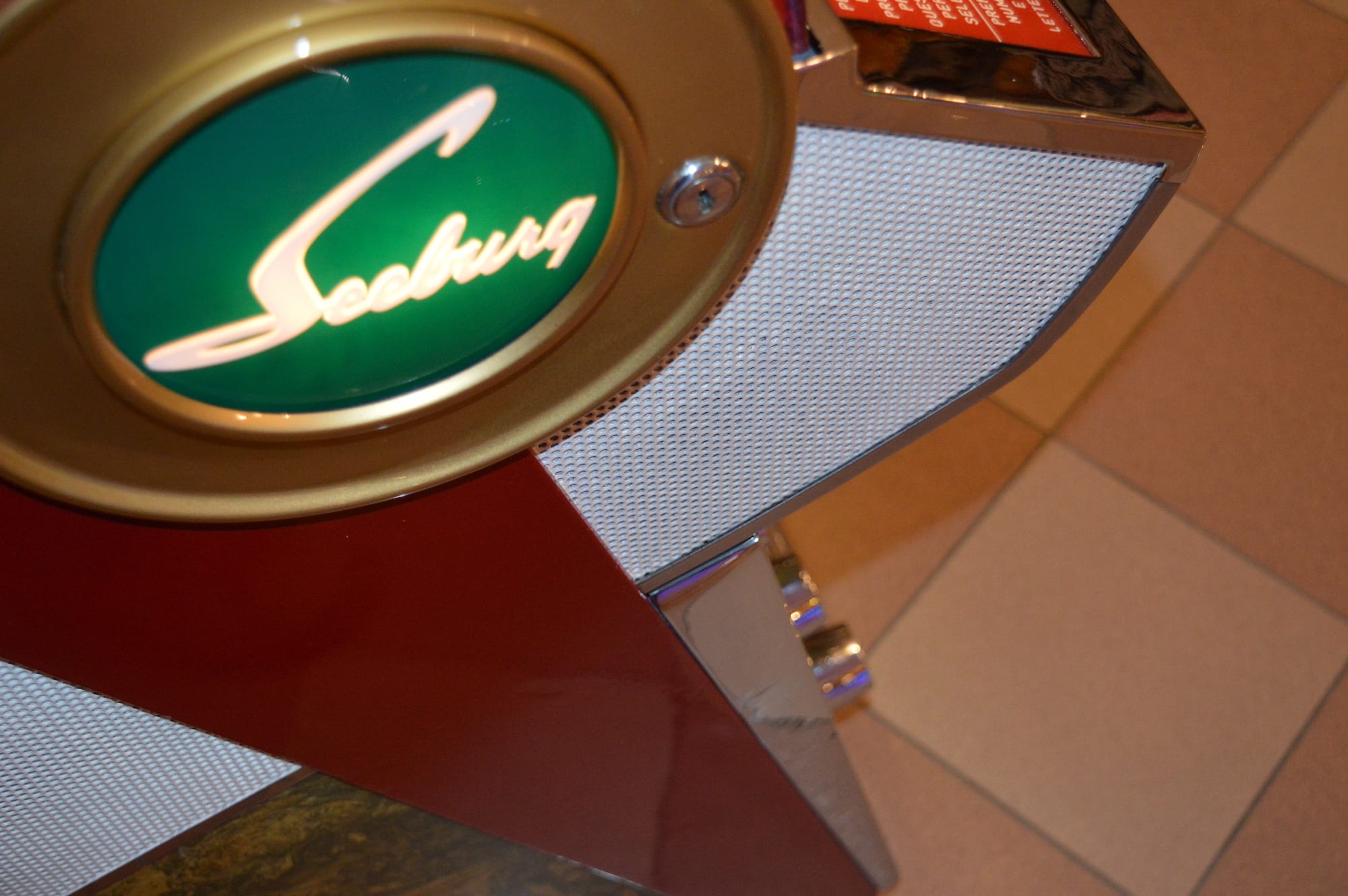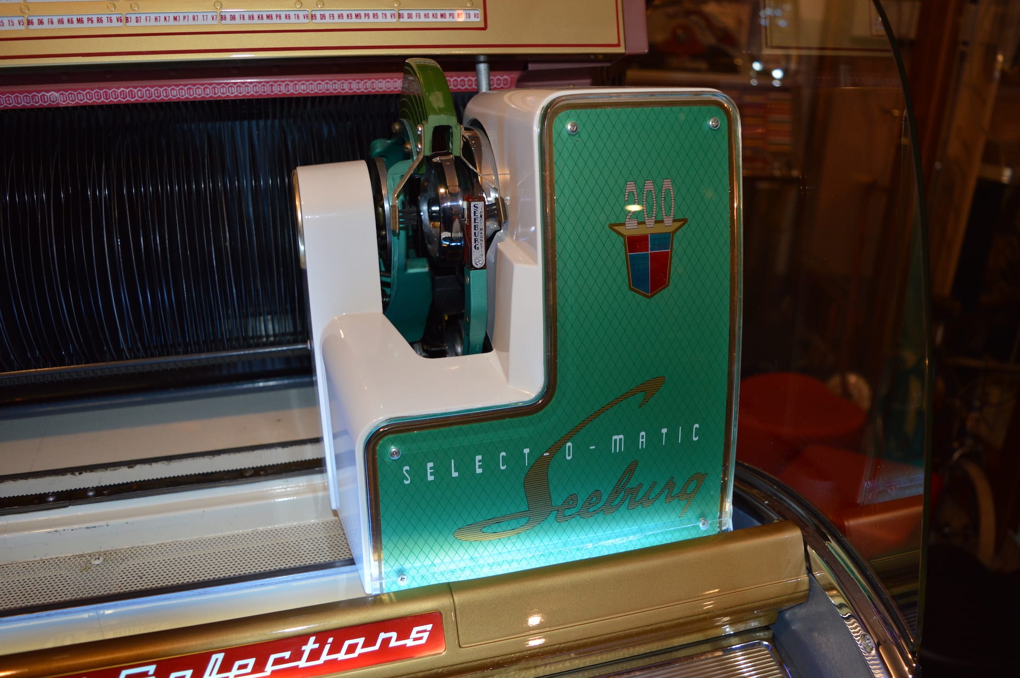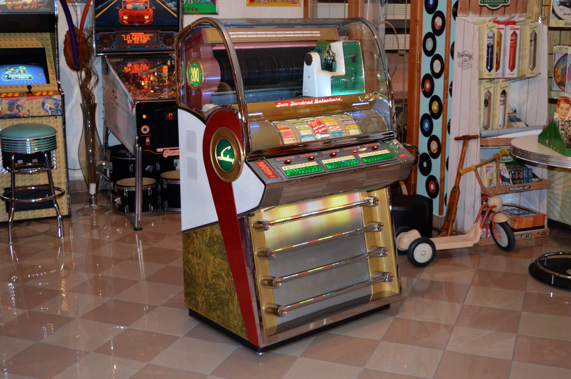 Il Juke box per intenditori! il modello V200 DEL 1955 è l’esatta dimostrazione di come la Seeburg abbia sempre puntato alle innovazioni tecnologiche, ma è anche uno dei più grandi capolavori di design degli Anni ’50. Il Seeburg V200 monta il consueto meccanismo Select-O-Matic a 45 Giri dal suono Fantastico, pieno ed avvolgente, e a differenza dei precedenti juke box, il V200 è stato il primo a contenere 100 dischi a 45 giri per un totale di 200 Selezioni, la difficoltà di esporre i cartellini dei titoli fu superata con il grosso tamburo rotante, diviso in cinque generi musicali……il suo stile pone il Seeburg V200 come uno degli emblemi del design degli anni ’50.