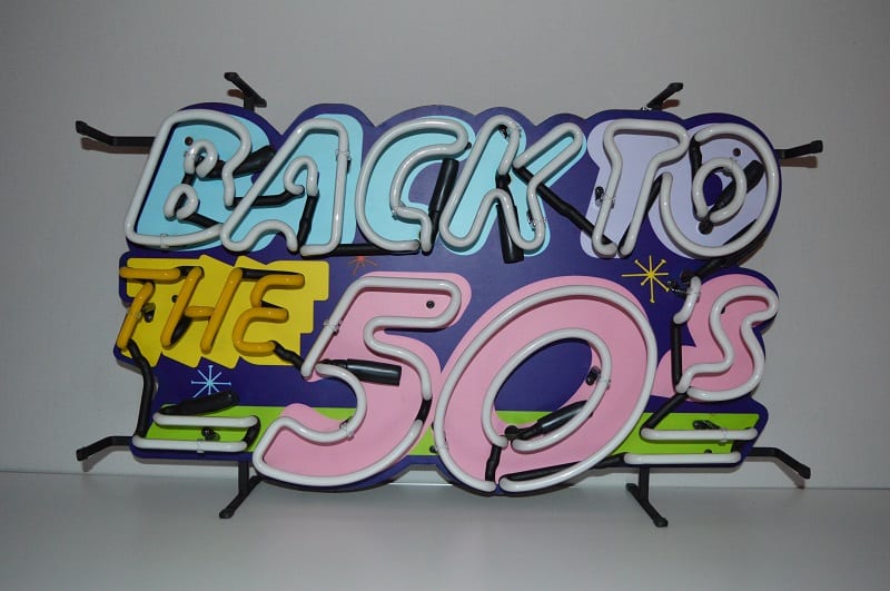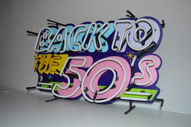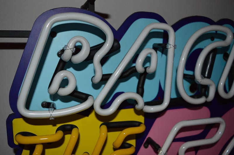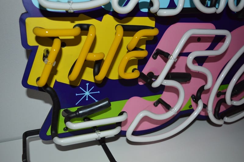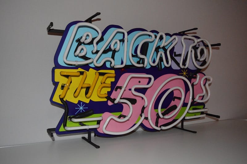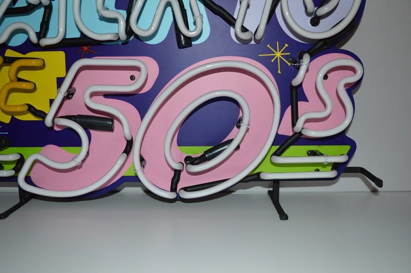 Insegna al Neon con tubo soffiato e lastra serigrafata sottostante ( ottimo effetto visivo anche da spento ), tutto montato su supporto metallico con piedini in gomma.