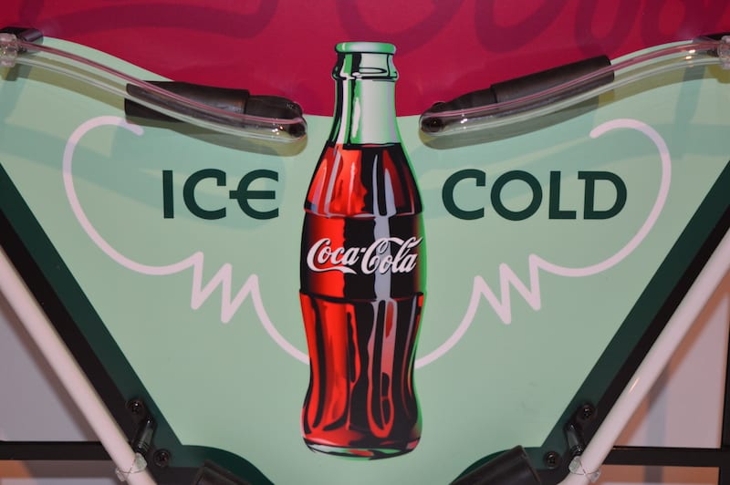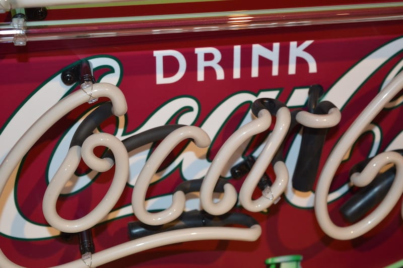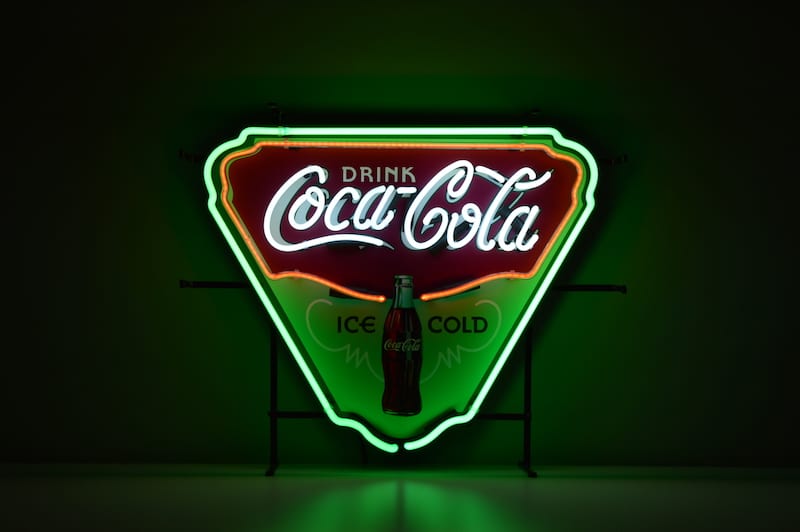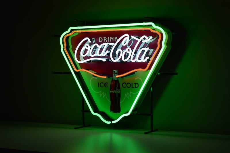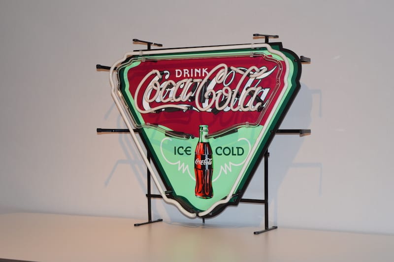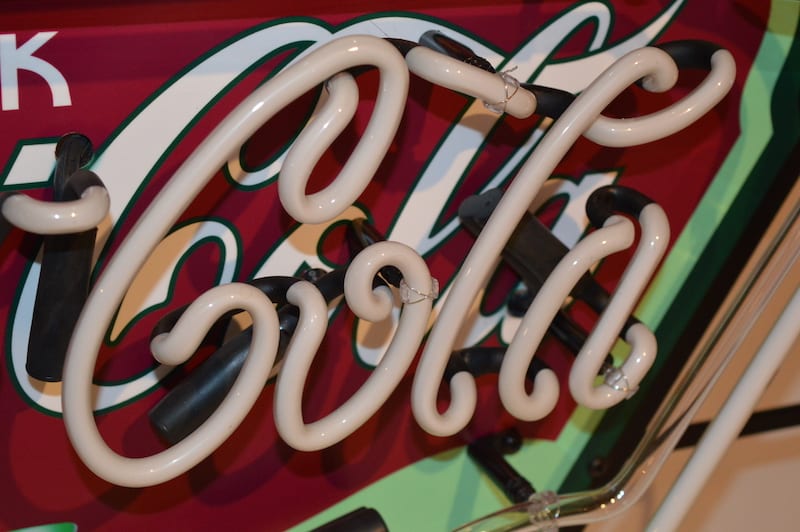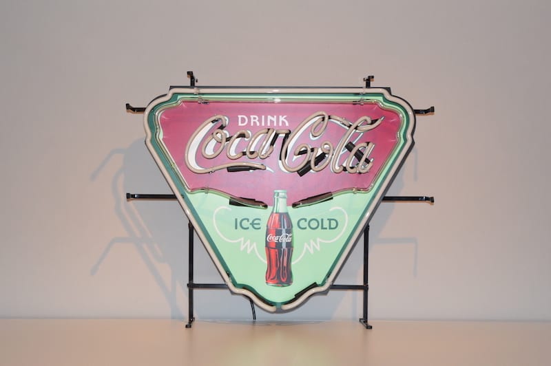 Insegna al Neon con tubo soffiato e lastra serigrafata sottostante ( ottimo effetto visivo anche da spento ), tutto montato su supporto metallico con piedini in gomma.