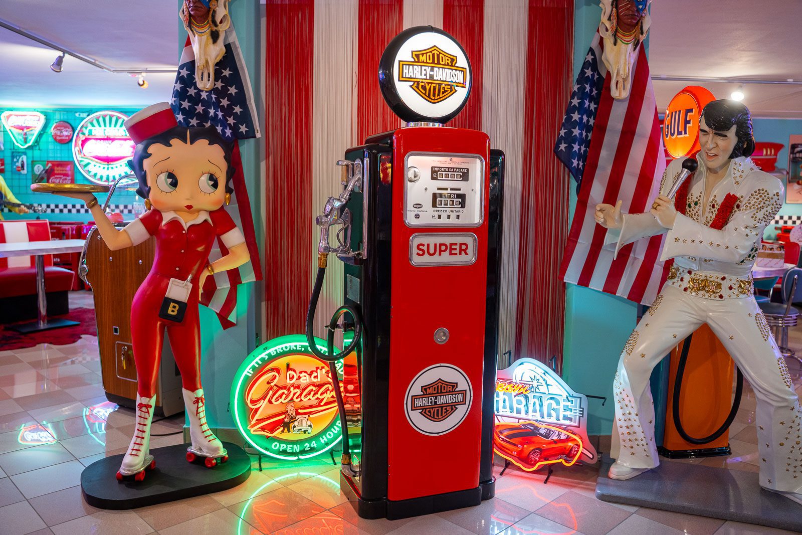 Il Restauro “Top Quality Restoration di Lusima” prevede un restauro completo e totale, la pompa viene rigorosamente smontata, eventuali buchi formati dalla ruggine vengono tappati con pezze di lamiera dal nostro esperto saldatore, in una fase successiva viene eseguito un processo di sabbiatura di tutta la parte interna del telaio di supporto e di tutti i lamierati. Tutti i pannelli vengono meticolosamente smontati e ripristinati. Due mani di fondo e vernice acrilica rendono la parte finitura ultra liscia e specchiata, Il globo viene sostituito con una copia fedele all’originale di un tempo, tutto il cablaggio elettrico viene fatto nuovo.